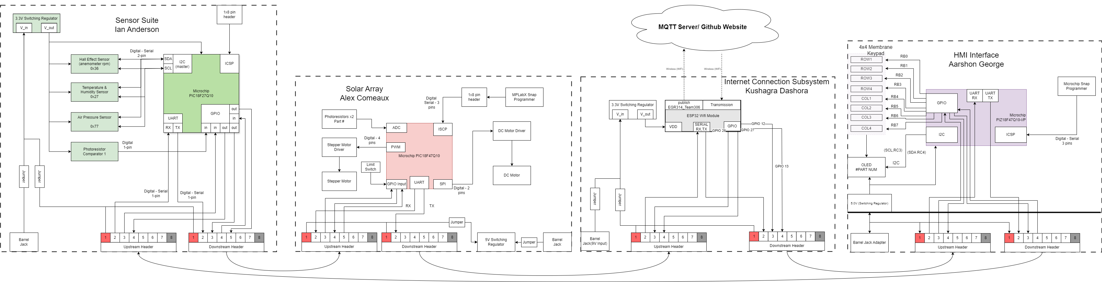 The MacroChip Weather Station is organized into four interconnected subsystems, each handled by a different team member: the HMI Module, Sensor Suite, Solar Actuator, and Internet Communication module. These subsystems are linked in a daisy-chain bus topology.