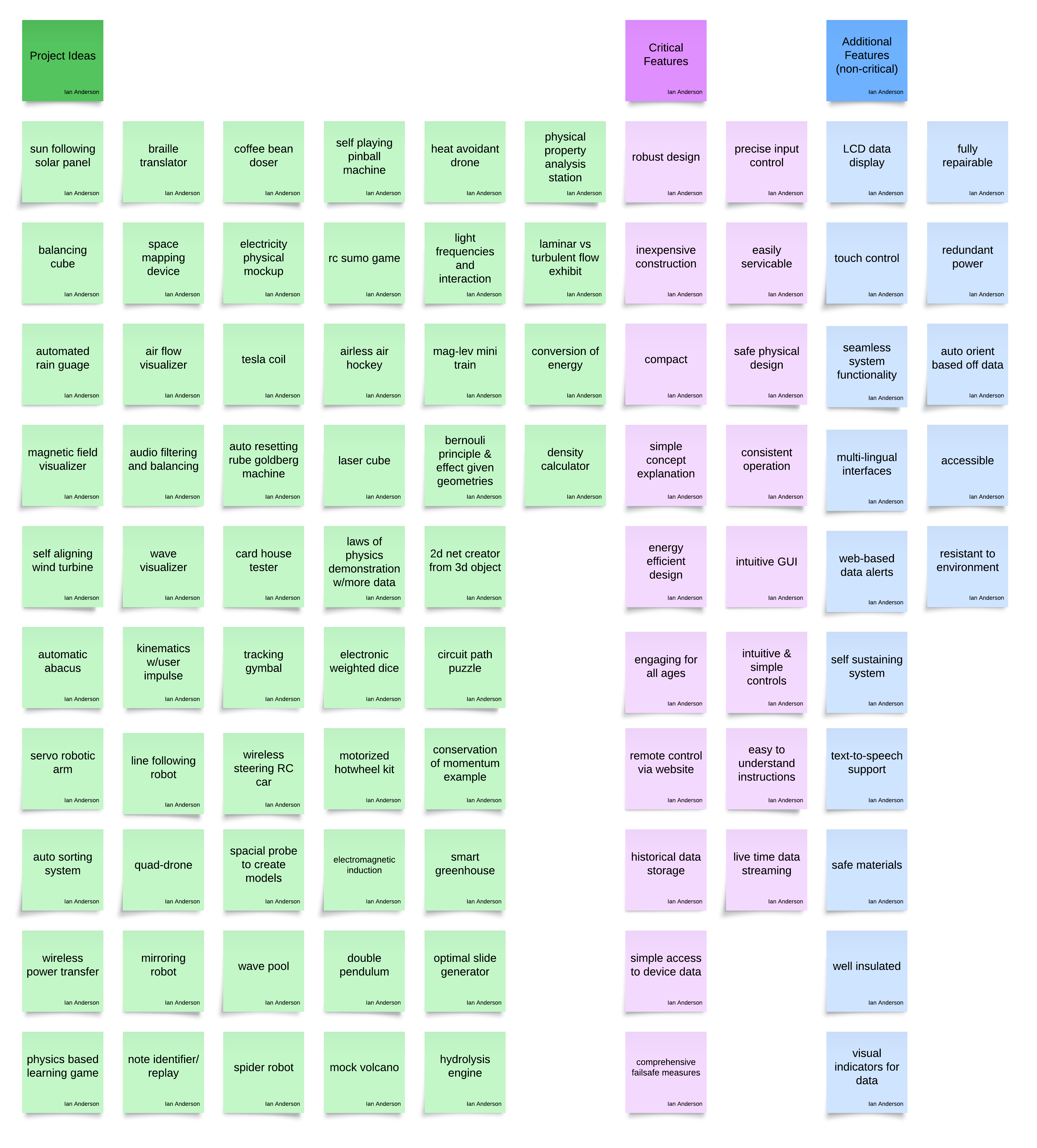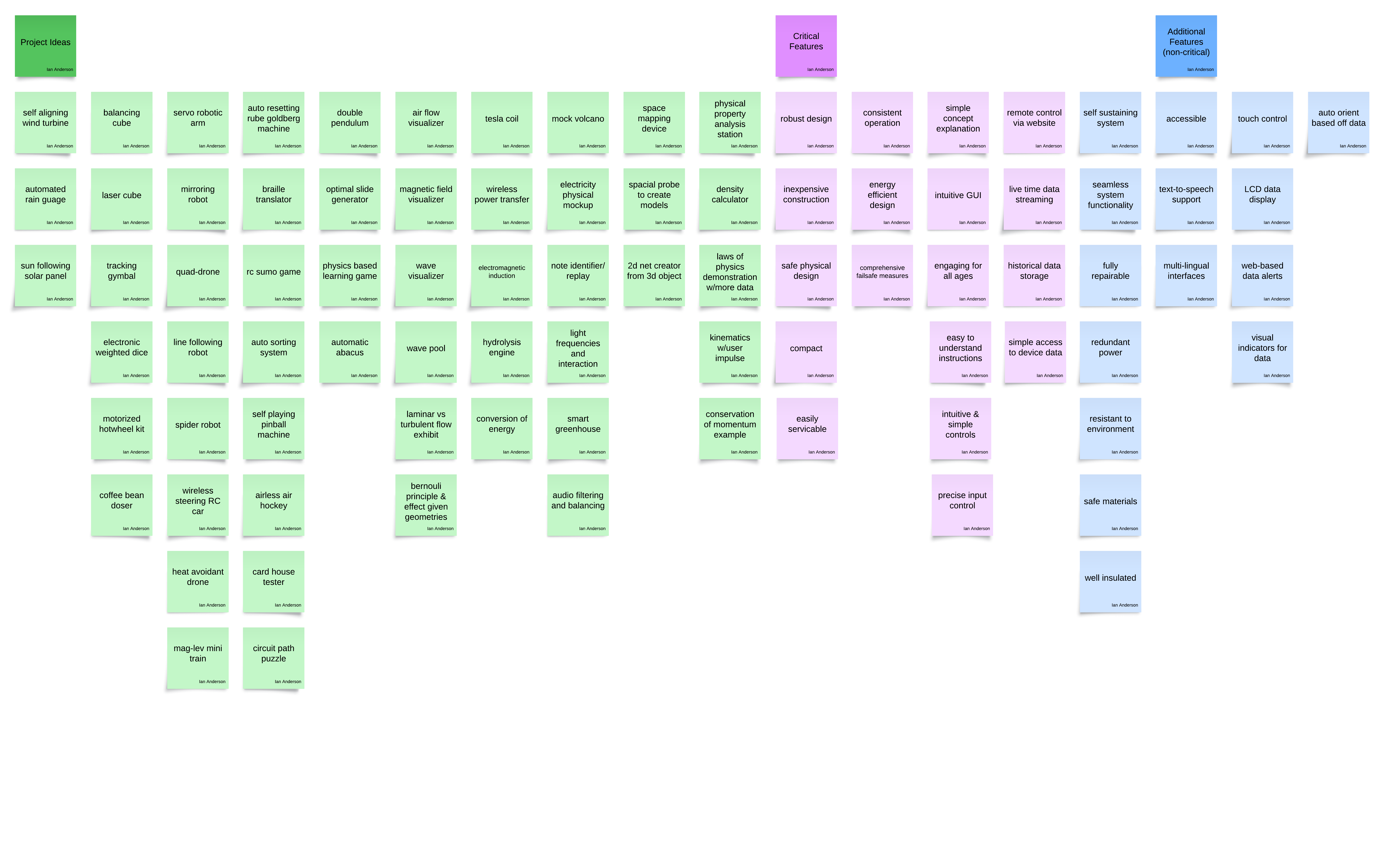 These ideas were then organized into three main categories. The first catagory, depicted in green, is all of the various exhibit ideas that we produced. The magenta notes are critical features or criteria that need to be achieved. The other features shown in blue are not necessary to the final exhibit but could be interesting additions if possible. These groups were then further organized by similarity into columns. We then combined various subgroups to arrive at our concept.