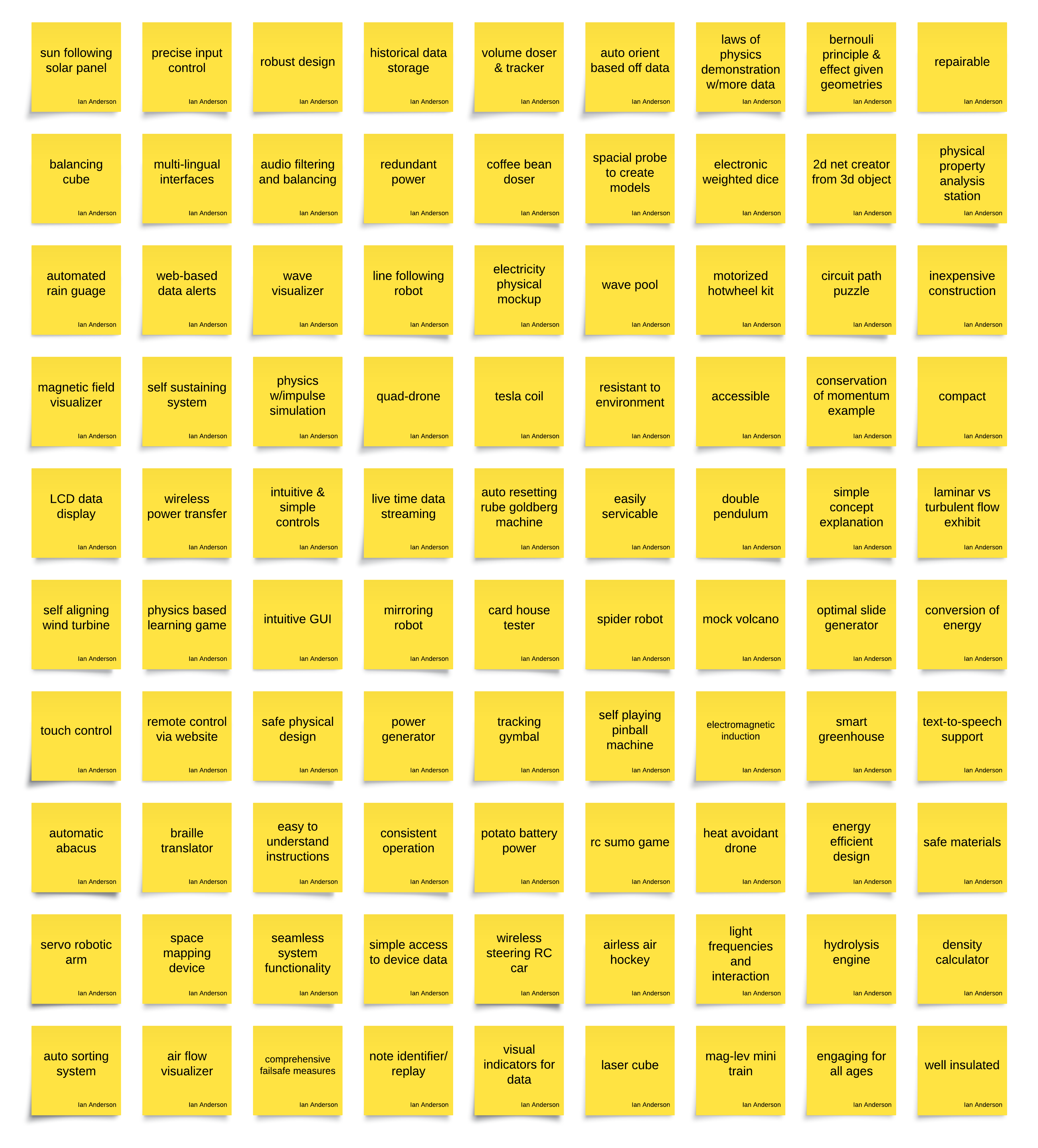 We met together to discuss possible ideas and design criteria. Every idea was accepted to broaden our options. Each idea was given its own note and was place on the below board. Design Brainstorming: At the project’s outset, the team engaged in extensive brainstorming to generate a wide range of exhibit ideas and features. All ideas were recorded on notes and grouped by themes such as potential exhibit concepts, critical features, and “nice-to-have” additions